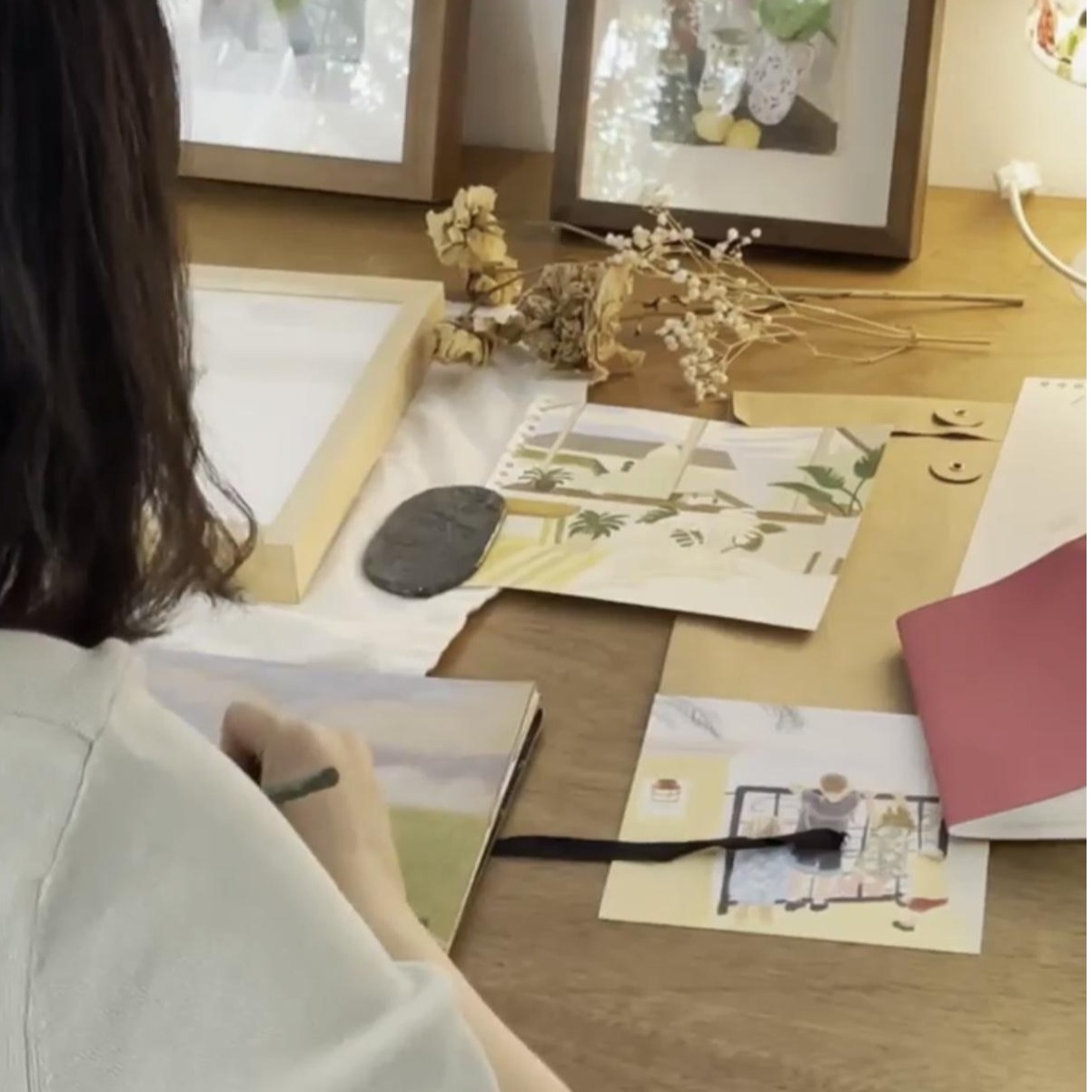 그녀는 일상의 소소한 순간과 개인적인 경험에서 영감을 얻습니다. 흔히 지나치기 쉬운 그 작은 순간들을 세심하게 관찰한 뒤, 색의 겹과 선의 결을 통해 재구성함으로써 ‘익숙하지만 낯선’ 이야기를 만들어 냅니다. 보는 이로 하여금 가만히 숨을 고르고 마음속 깊은 곳에 잔잔한 위로를 건네도록 이끕니다.